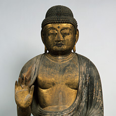 像の背に載せた蓮華座上に結跏趺坐します。鎌倉時代に文殊・普賢が脇侍として加えられたものと考えられます。